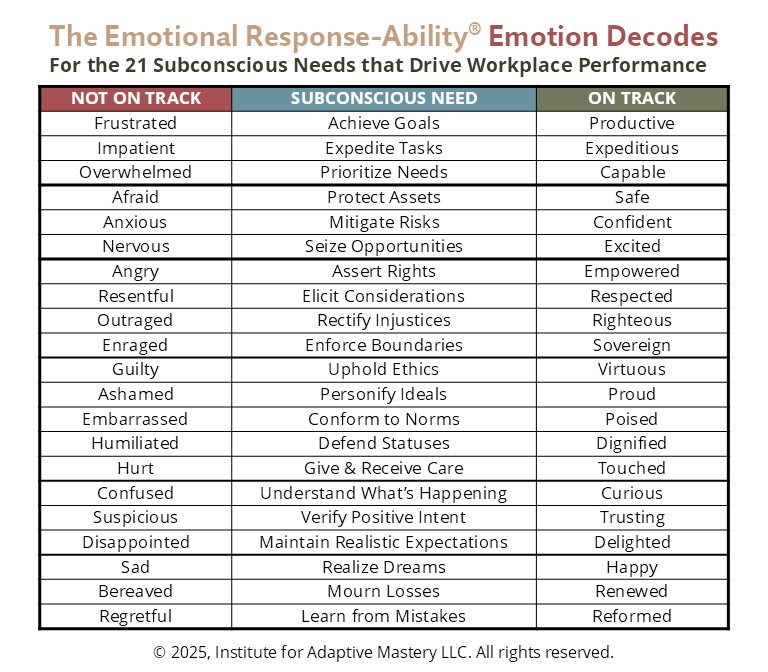 Emotional Response-Ability® (ERA) is a breakthrough framework for transforming stress into creativity, conflict into collaboration, and victimhood into ownership. Founded on the revolutionary insight that emotions originate in subconscious needs, ERA equips leaders to harness every emotion to increase their effectiveness.